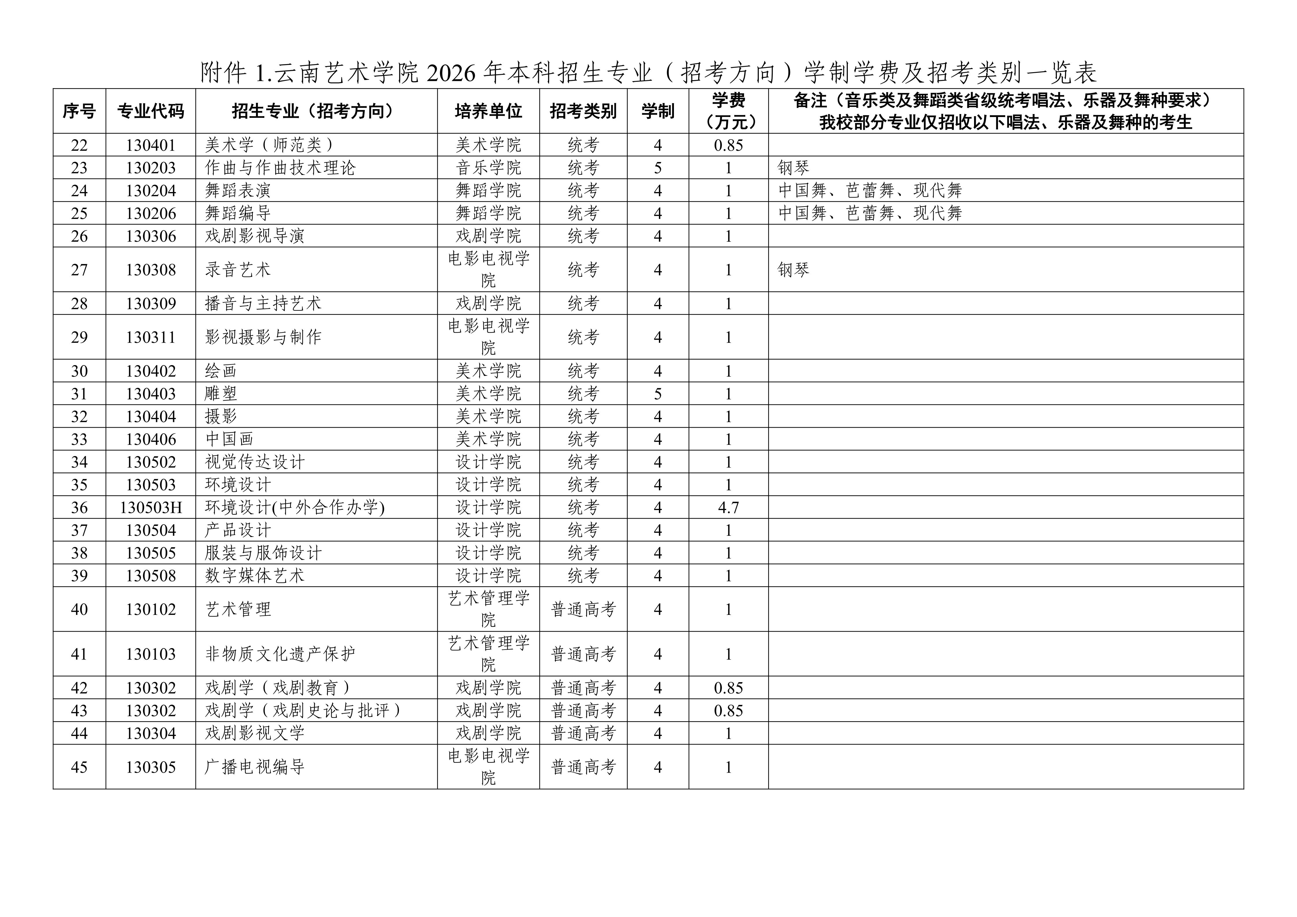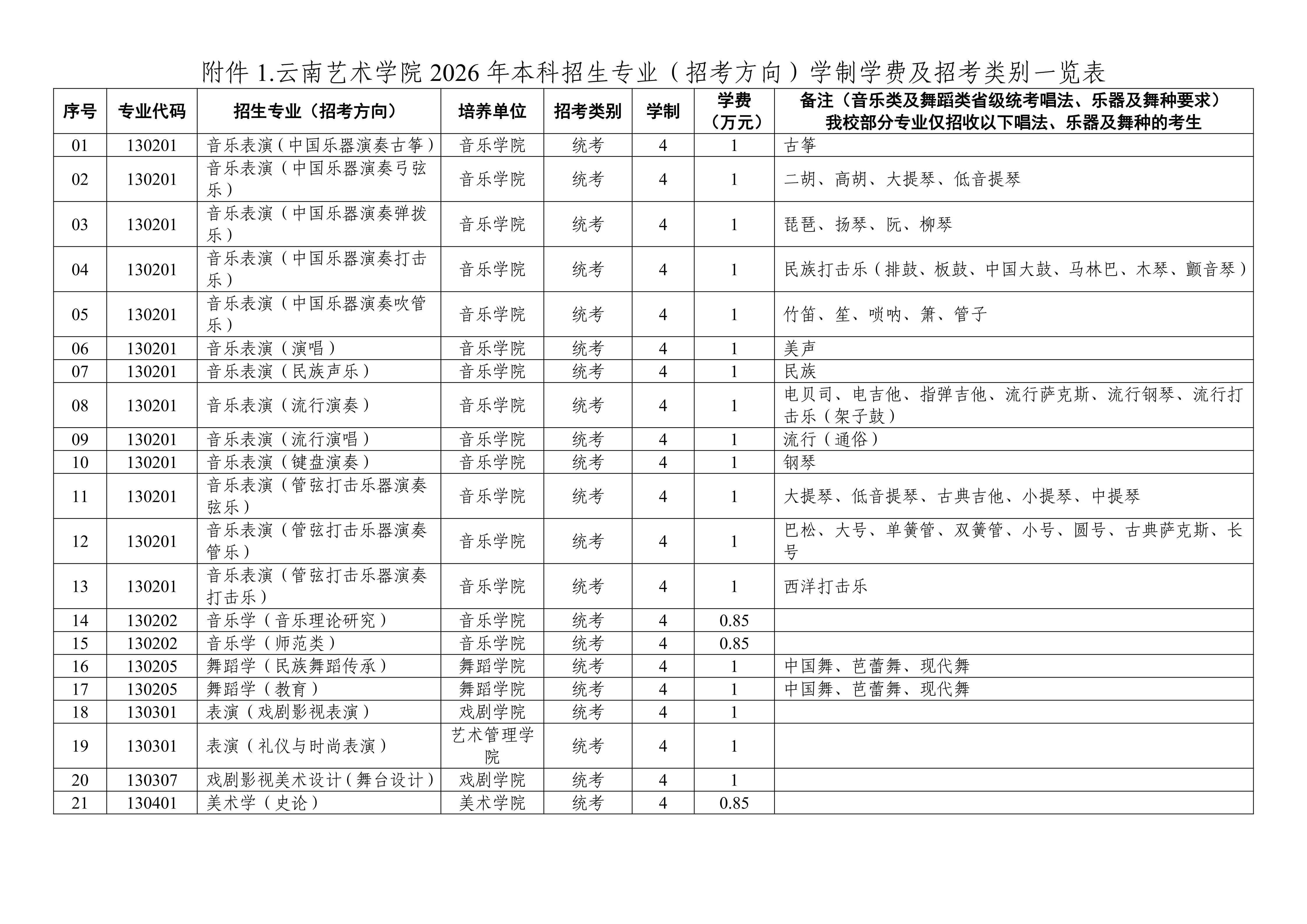 附件:1.云南艺术学院2026年本科招生专业(招考方向)学制学费及招考类别一览表