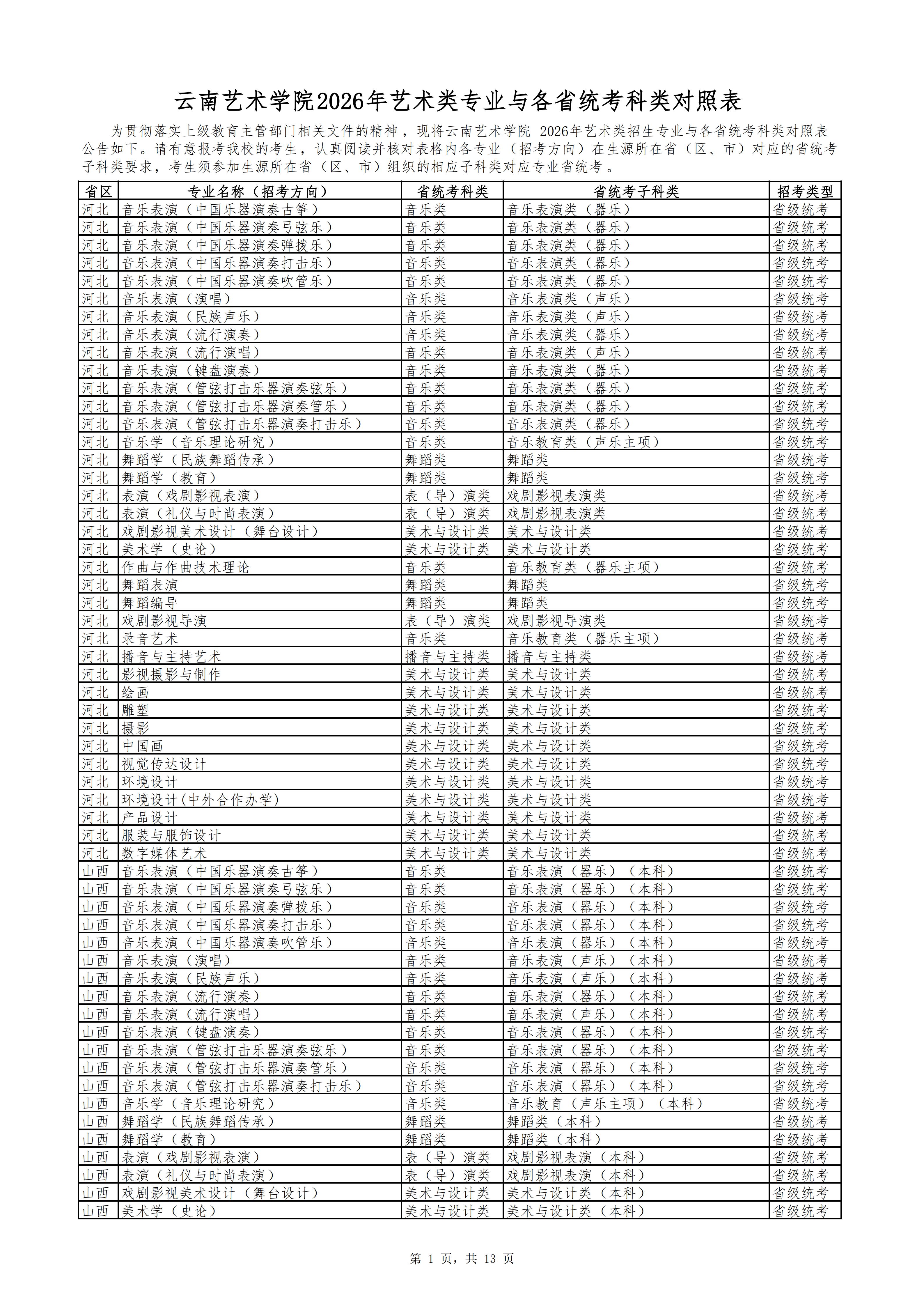 (2)我校招生各专业与艺术类省级统考科类对照关系详见《云南艺术学院2026年艺术类专业与各省统考科类对照表》(附件2)。