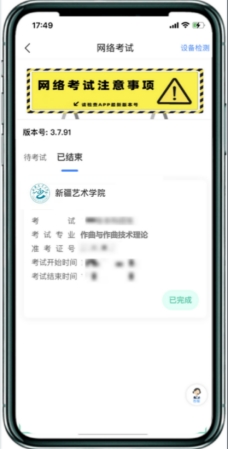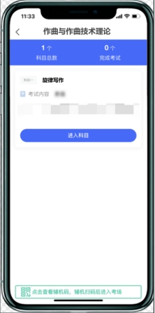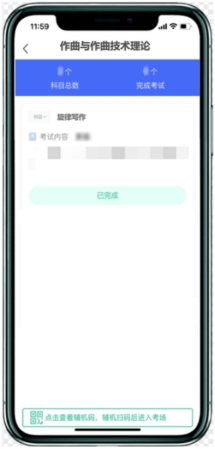 考前主机登录艺术升APP,在首页或报考页选择“网络考试”,找到新疆艺术学院作曲与作曲技术理论专业相应科目,点击“正式考试”按钮,弹出二维码。此时需要用辅机打开艺术升APP(不登录),在辅机艺术升首页右上角打开扫描工具“[-]”,辅机扫描主机上弹出的二维码,辅机扫码成功后进入监考状态。