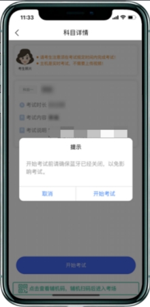 在进入正式考试前,请仔细阅读“提示”信息,继续选择“开始考试”。如辅机网络异常中断,可点击主机本页的绿色区域,辅机扫码连接。