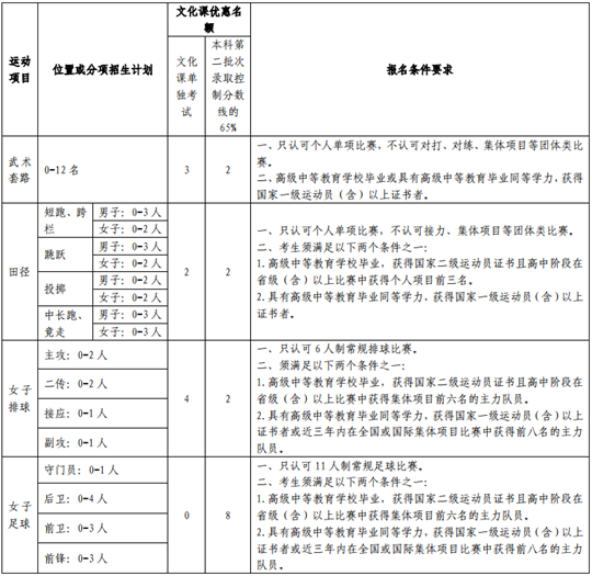 1.对于获得国家一级、国家健将、国际健将运动员称号的考生,我校将从体育专项测试合格且文化课单独考试合格的生源中择优选拔确定拟录取考生名单,该类考生经本人申请,生源所在省级招生管理部门核准后,可免于参加普通高等学校全国统一招生考试。此类考生拟录取公示人数不超过我校当年高水平运动队招生计划的20%。