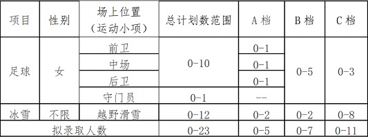 我校2021年高水平运动队招生计划总数不超过23人,其中足球计划招收11人;冰雪(越野滑雪)计划招收12人。