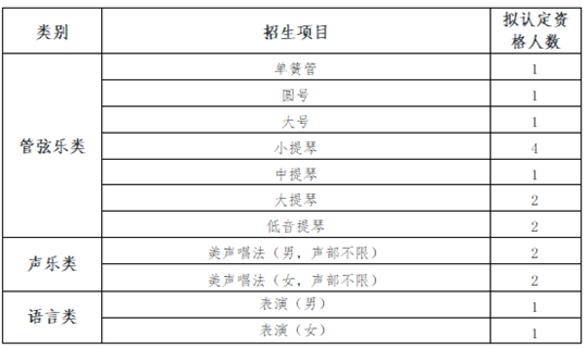 我校2022年高水平艺术团招生计划为9人,拟认定资格考生不超过18人,各招生项目及拟认定资格人数如下: