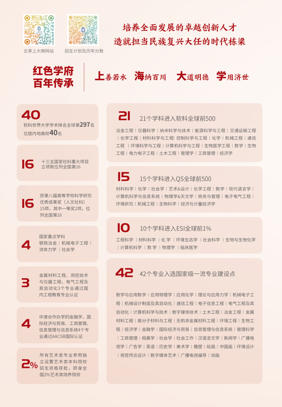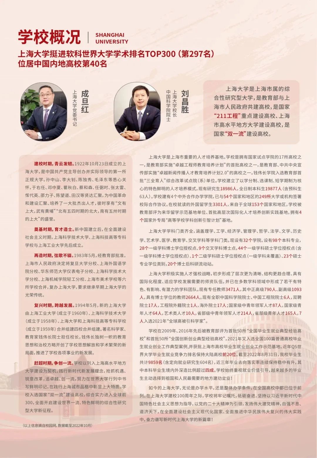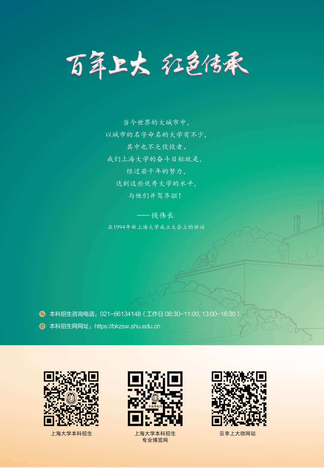 赶超时期,争创一流。学校以列入上海高水平地方大学建设为契机,践行新时代新发展理念,抢抓机遇、锐意改革,追卓越、创一流,努力在世界大学行列中书写鲜明印记,在践行上海城市品格中彰显上大特质。学校入选国家“双一流”建设高校,综合实力进入全球前300,全面开启建设世界一流、特色鲜明的综合性研究型大学新征程。