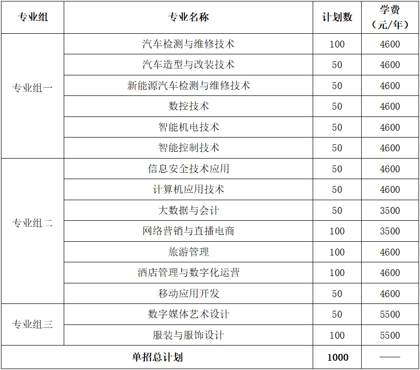 第十二条 我校2024年单招总计划数为1000人,其中包含单列计划的退役军人10人、体育特长生10人。本校2024年招生专业共15个。分专业单招计划及学费标准如下表,各专业最终学费标准以2024年湖南省物价主管部门审核为准。